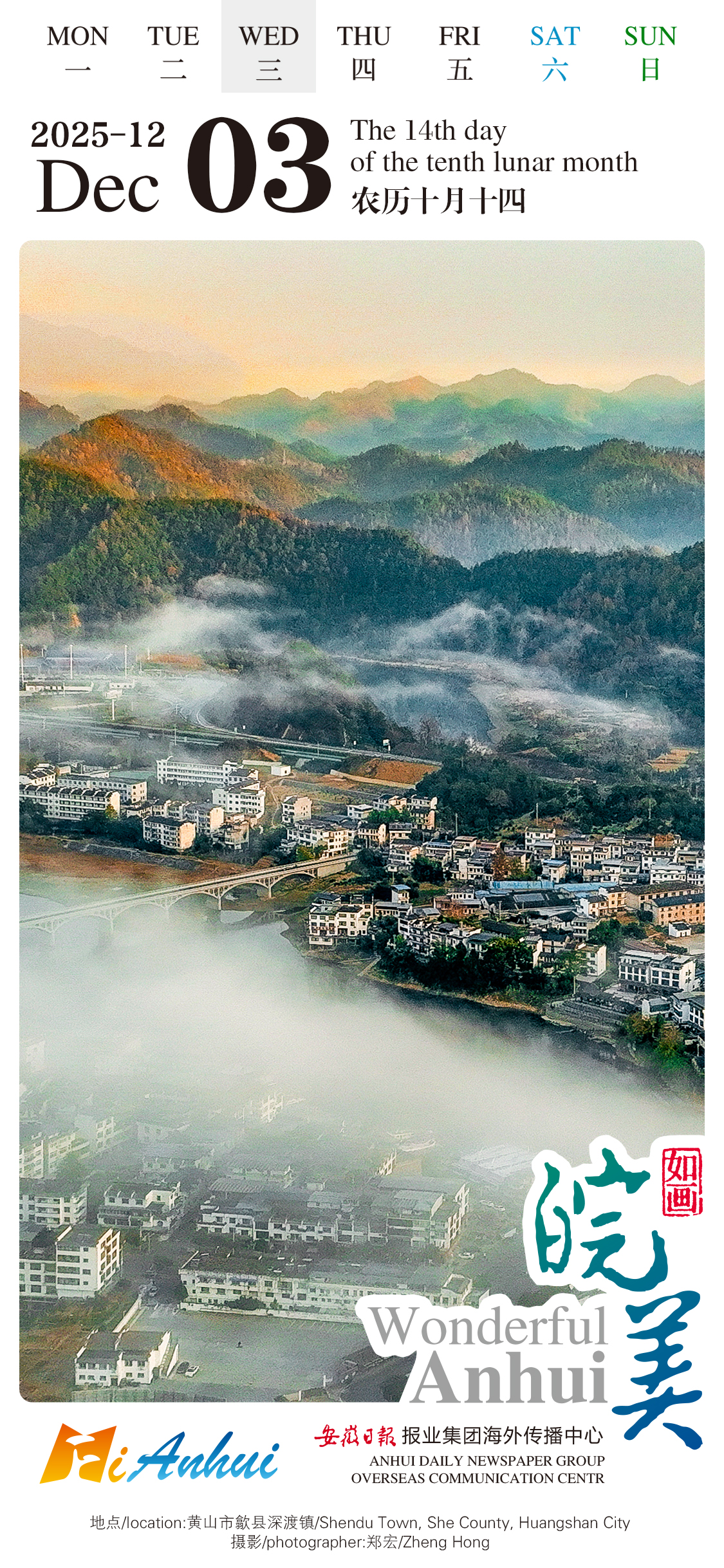 As for today’s "Wonderful Anhui" English calendar, let’s appreciate the beautiful scenery of Shendu Town, Shexian County, Huangshan City, Anhui. Immerse yourself in the breathtaking views of Xin'an river landscape gallery in the mist-veiled town here!