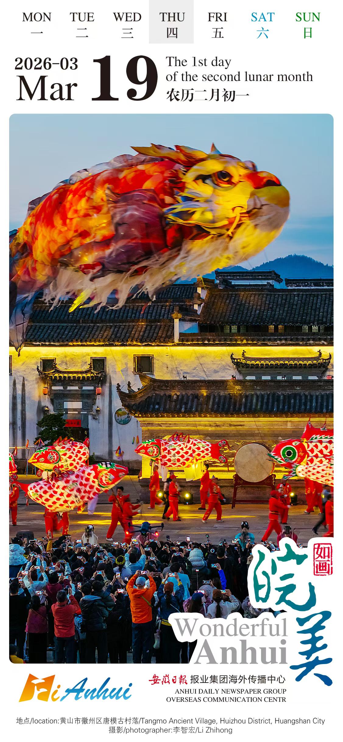Experience joyful vibes of fish lanterns in Tangmo Ancient Village, Huizhou District, Huangshan City with the "Wonderful Anhui" English calendar! Performers in bright red costumes carry glowing fish-shaped lanterns, attracting residents and visitors to appreciate and take photos.