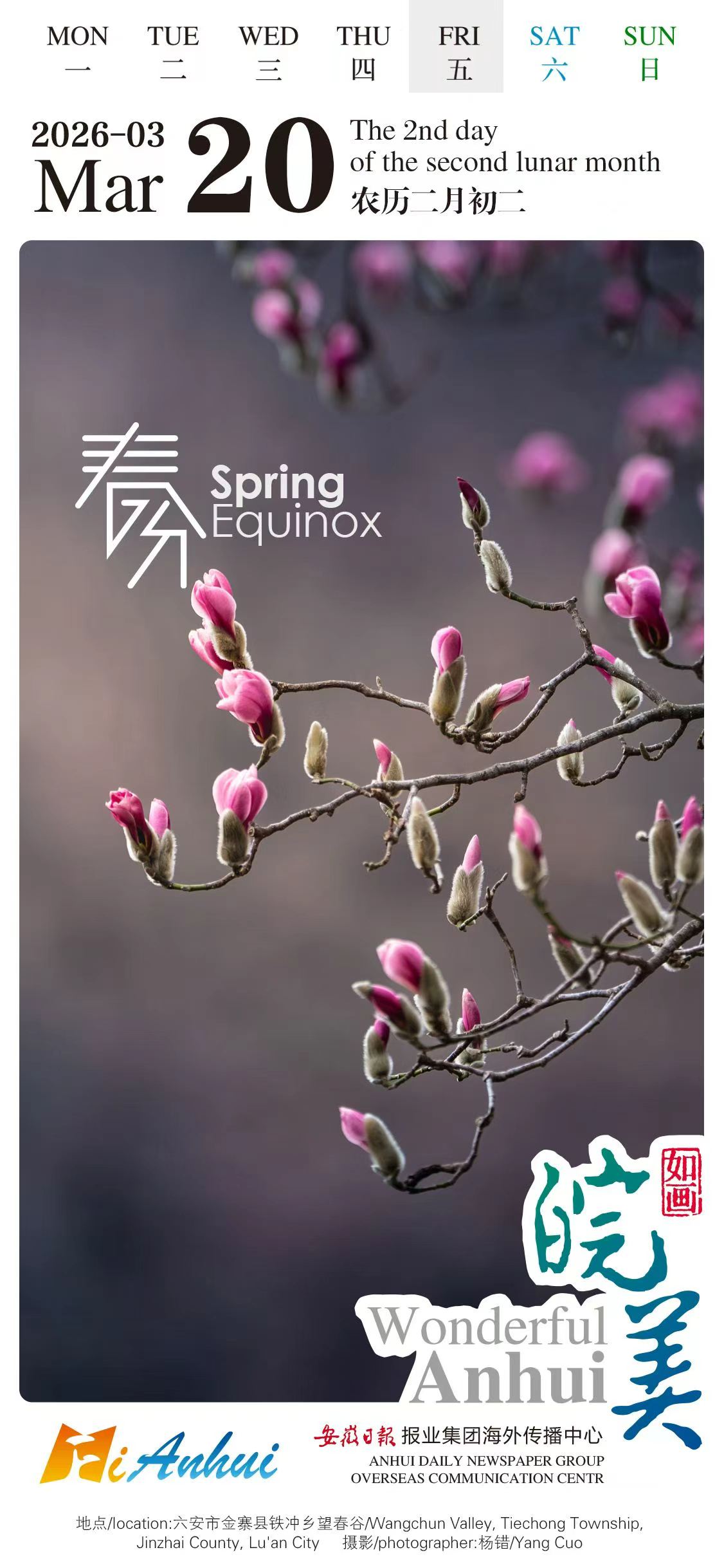 Today marks Spring Equinox, signaling the equal length of the day and night time. Let’s embrace the blooming springtime landscape of budding and blooming magnolias in Wangchun Valley, Tiechong Township, Jinzhai County, Lu’an City.