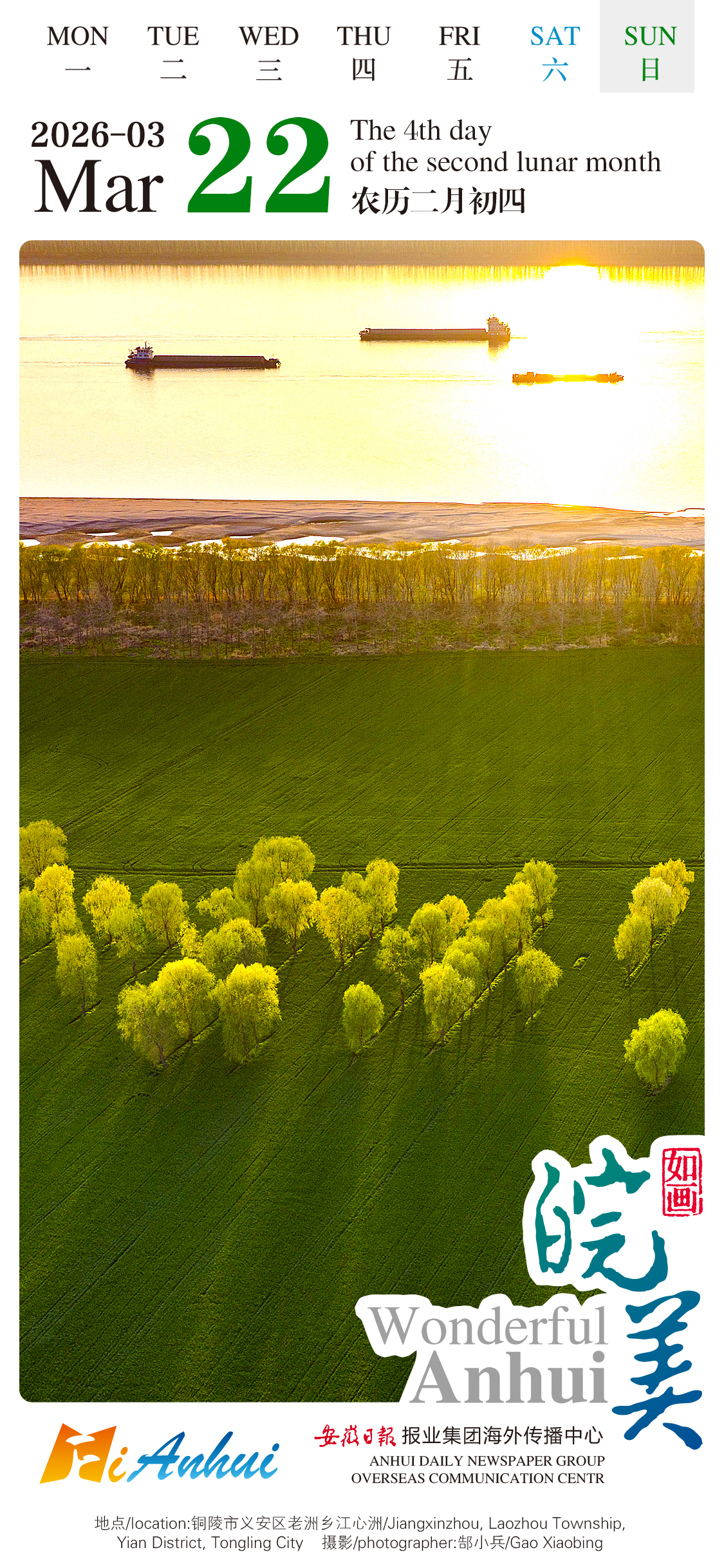 Follow the "Wonderful Anhui" English calendar and enjoy the poetic landscape of of Jiangxinzhou, Laozhou Township, Yian District, Tongling City. Bathed in gentle sunlight, boats across the lake, vibrant trees, and lush fields, blend into a poetic tapestry.
