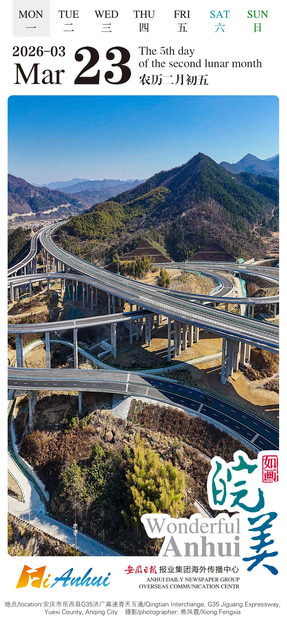 Follow the "Wonderful Anhui" English calendar and have a glimpse of infrastructure development at Qingtian Interchange, G35 Jiguang Expressway in Yuexi County, Anqing City.