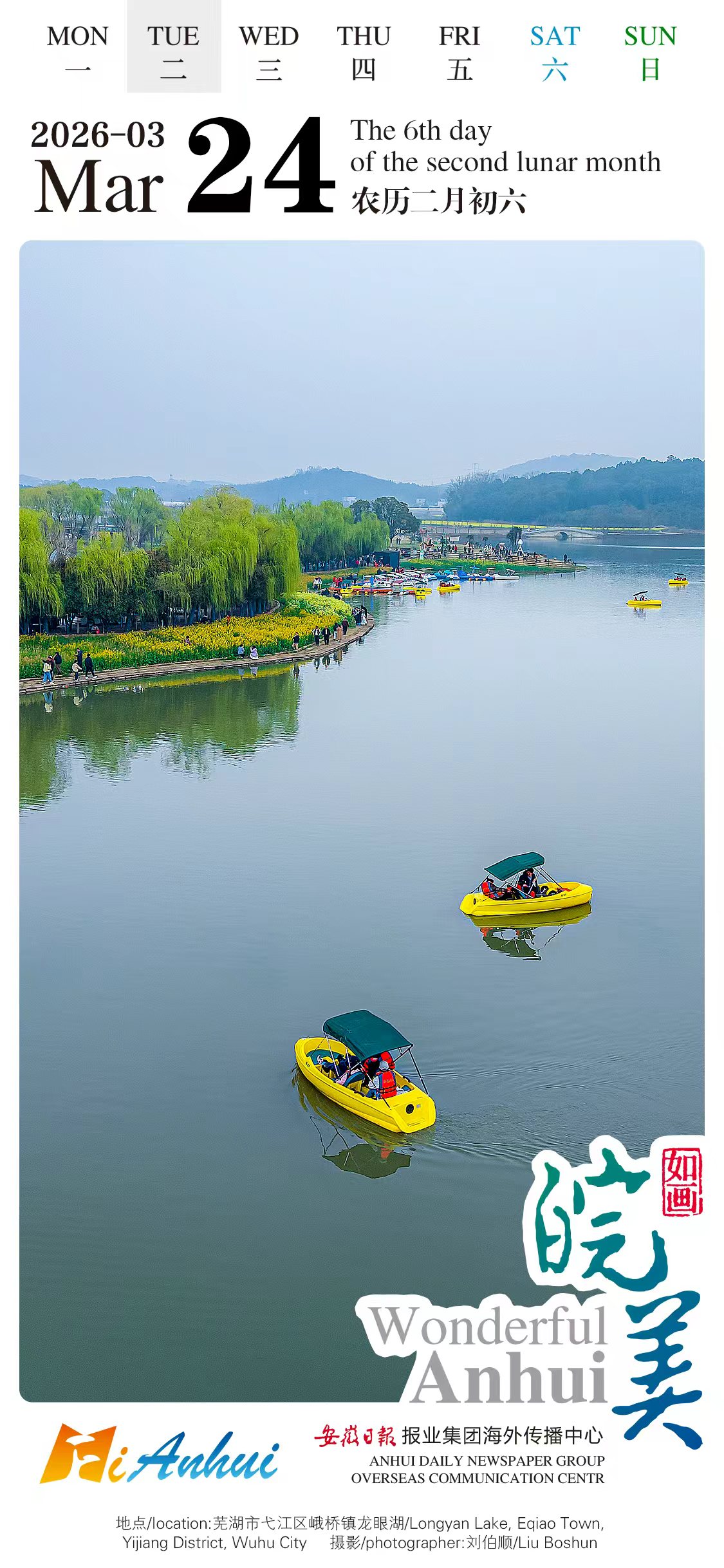Join the "Wonderful Anhui" English calendar and enjoy natural beauty of Longyan Lake, Eqiao Town, Yijiang District, Wuhu City. Take a boat on the rippling lake, admire lush greenery along the banks, and feel worries fade away with the breeze!