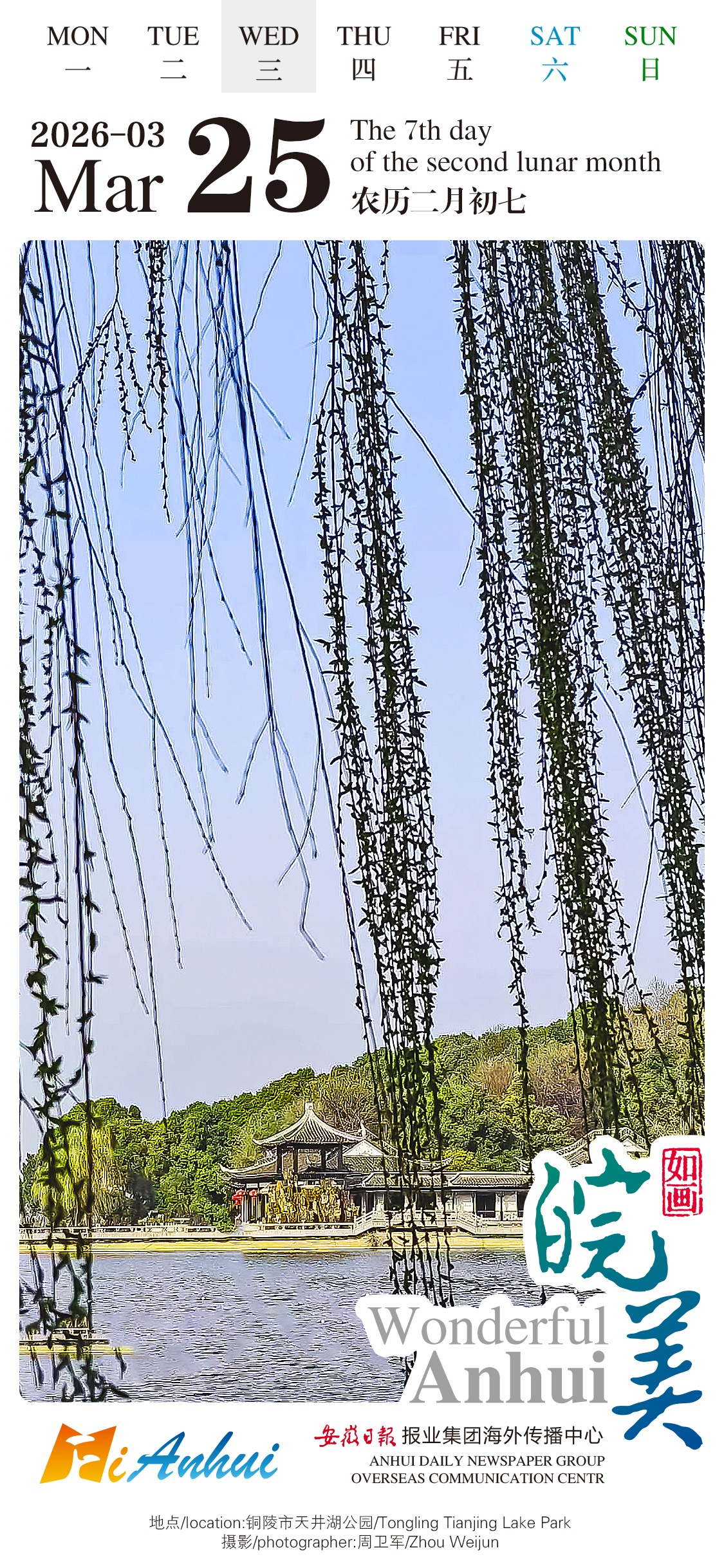 Join the "Wonderful Anhui" English calendar and appreciate natural splendor of Tianjing Lake in Tongling City. Stroll around, admire crystal blue water, and enjoy lush greenery. The “20-minute park effect” lives up to its name—pure relaxation!