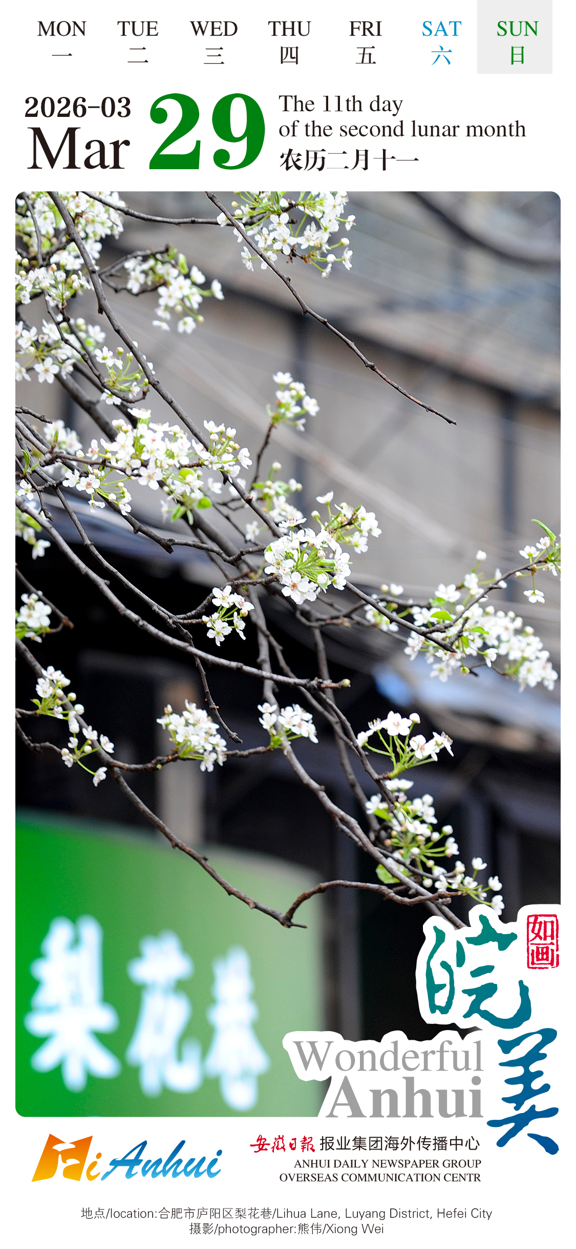 Enjoy spring vitality of streets with the "Wonderful Anhui" calendar. Start a tour of Lihua Lane in Luyang District, Hefei City where pear blossoms burst into full bloom, filling the air with delicate fragrance and breathing new life into this century-old alley.