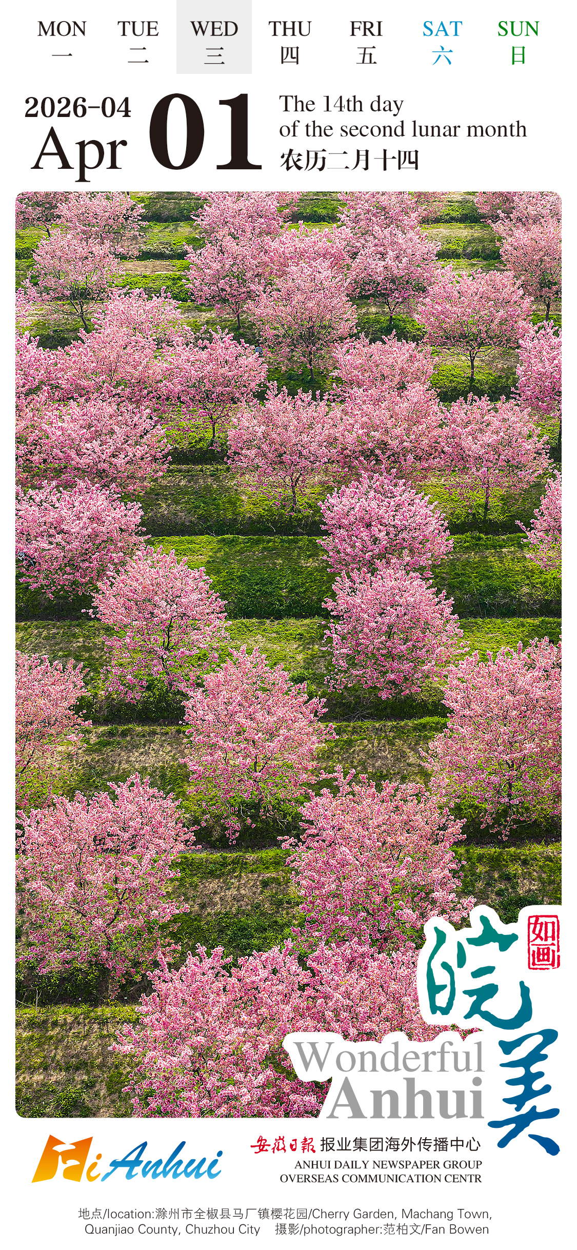 Follow the “Wonderful Anhui” calendar and enjoy vibrant spring scenery in Machang Town, Quanjiao County, Chuzhou City, where clusters of cherry blossoms weave into a pink wonderland.