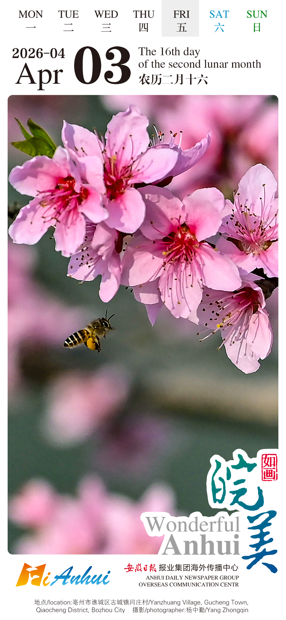 Follow the “Wonderful Anhui” calendar and start a trip to Yanzhuang Village, Gucheng Town, Qiaocheng District, Bozhou City, where you could enjoy great springtime views of buzzing bees and blooming peach blossoms painting a vivid picture of spring vitality.