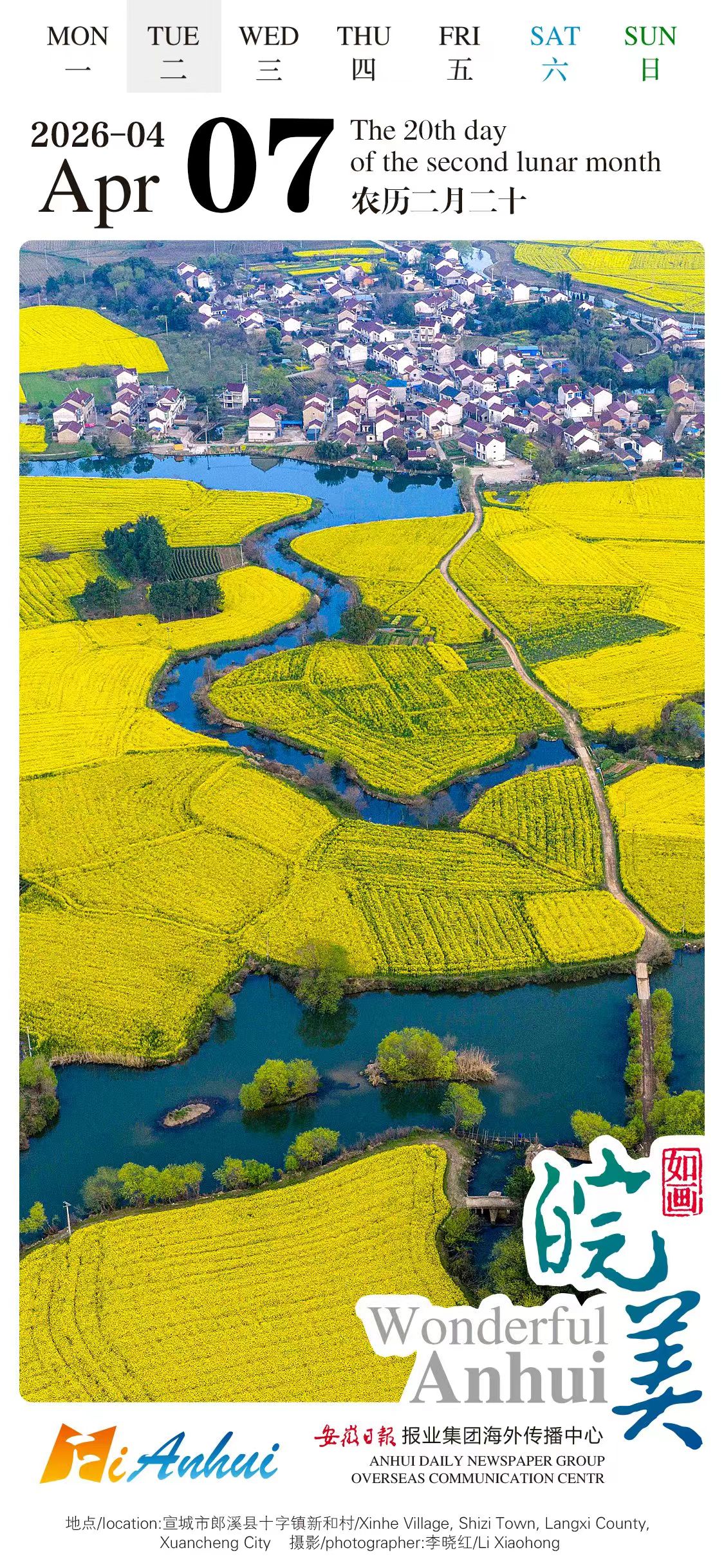 Join the “Wonderful Anhui” calendar and start a trip to Xinhe Village, Shizi Town, Langxi County, Xuancheng City where golden rapeseed fields bring the vibrant essence of spring to life.