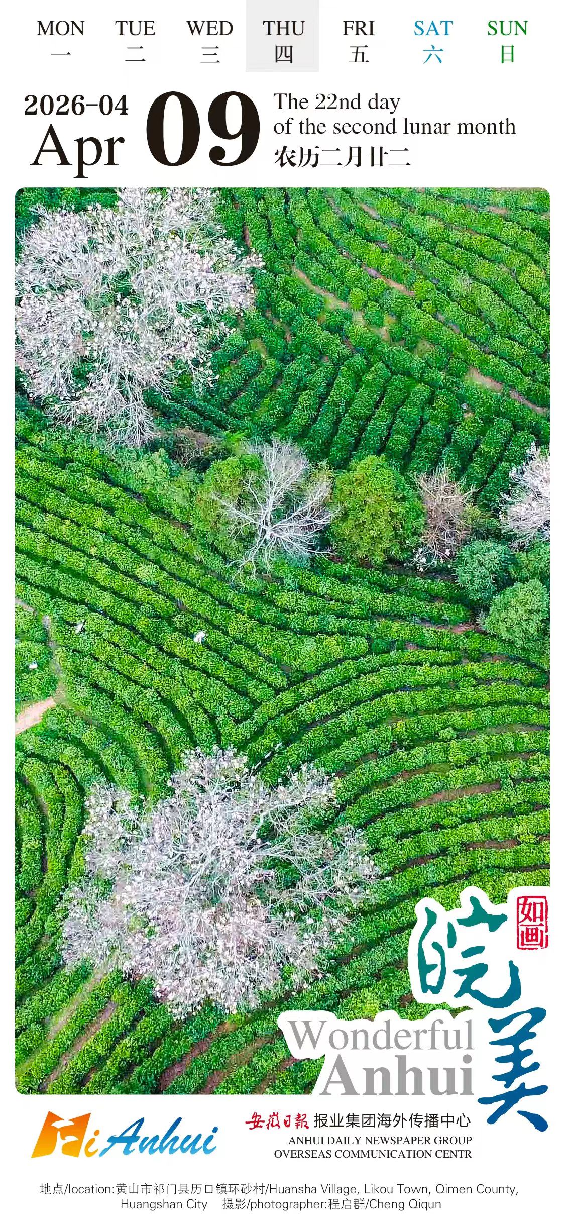 Join the “Wonderful Anhui” calendar and admire vibrant springtime scenery in Huansha Village, Likou Town, Qimen County, Huangshan City, where blooming phoenix tree flowers and lush green fields have blended into a beautiful spring tapestry.