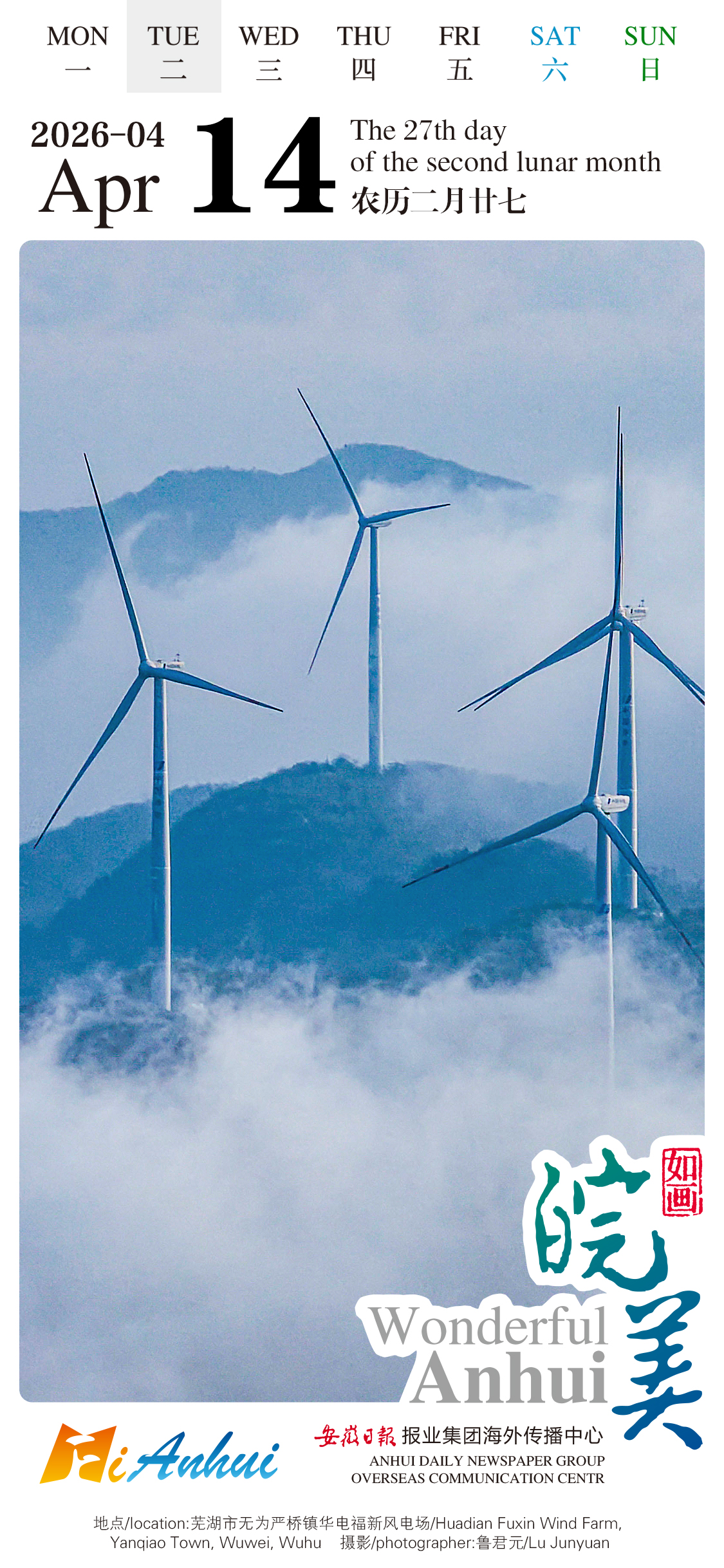 Follow the “Wonderful Anhui” calendar and travel to Huadian Fuxin Wind Farm in Yanqiao Town, Wuwei, Wuhu. Majestic wind turbines stand tall on misty mountain ridges, turning clean wind power into sustainable energy.