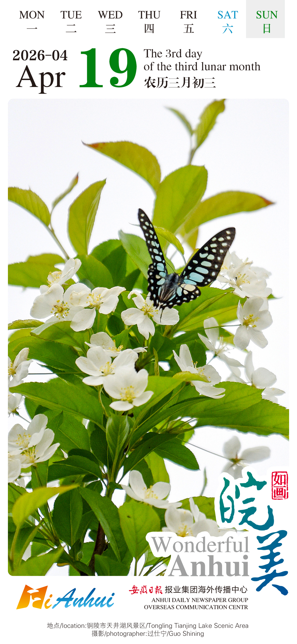 Follow the “Wonderful Anhui” calendar and enjoy vibrant springtime scenery of Tianjing Lake in Tongling. Blooming flowers with sweet fragrance is attracting a butterfly, creating a lively and vibrant picture.