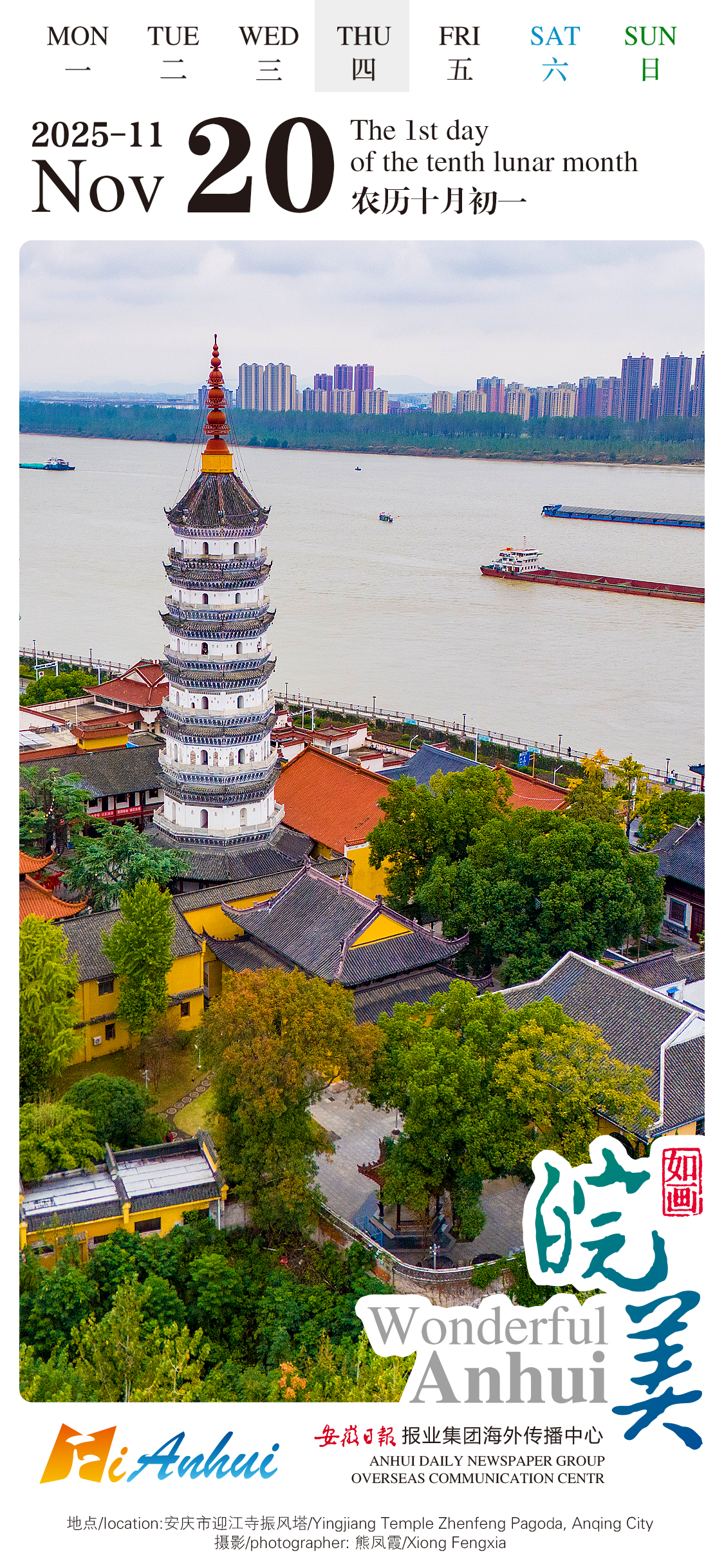As for today’s “Wonderful Anhui” English calendar, let’s feel cultural vibes in Zhenfeng Pagoda, Yingjiang Temple, and fantastic natural scenery of Anqing City in Anhui!