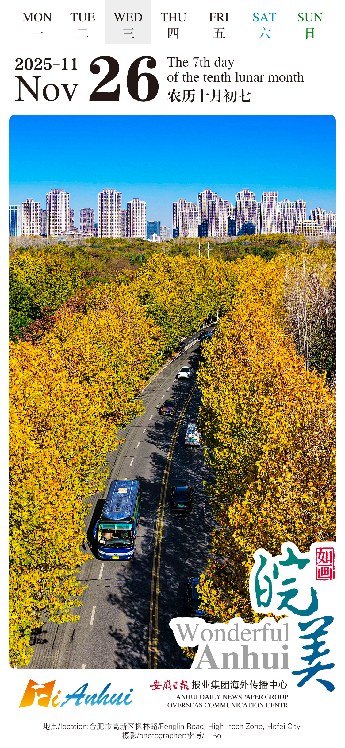As for today’s "Wonderful Anhui" English calendar, let’s stroll around Fenglin Road where you can see trees burst with vibrant colors like a natural palette spilled on the ground in Hefei City, Anhui.