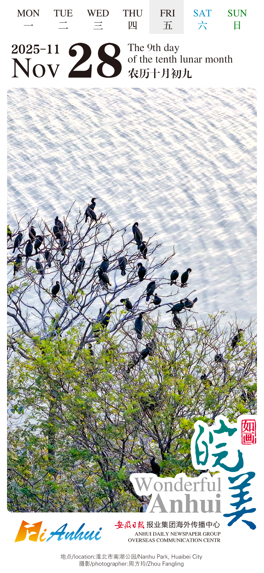 Join today’s "Wonderful Anhui" English calendar on a virtual tour of the Nanhu Park where you can see a gorgeous view of cormorants flying, foraging and frolicking in Huaibei City, Anhui.