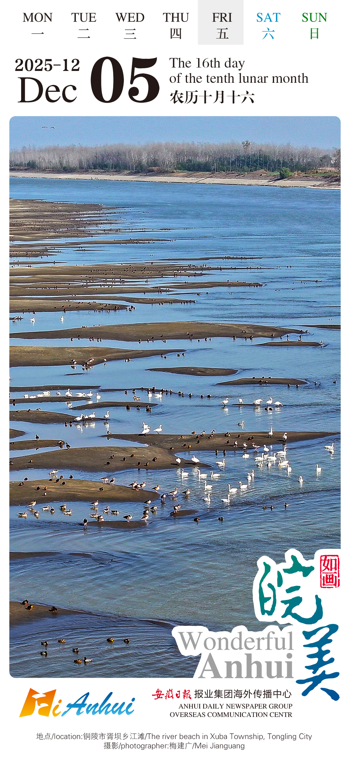 As for today’s "Wonderful Anhui" English calendar, let’s turn our attention to the fascinating ecological scenery of the riverbank in Xuba Township, Tongling City, Anhui. Flocks of migratory birds are foraging and resting, with the gurgle of water and chirps of birds weaving into a harmonious natural melody here.