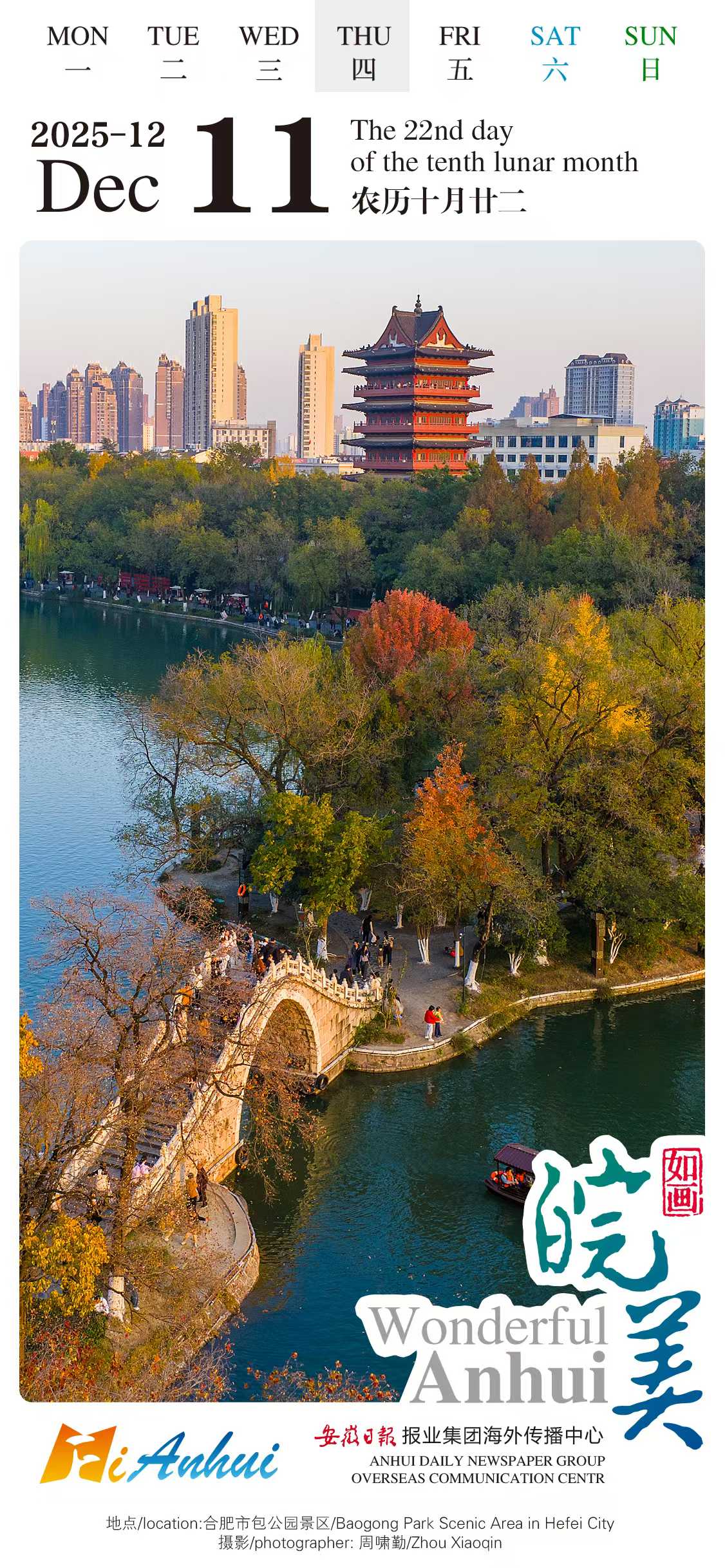 As for today’s "Wonderful Anhui" English calendar, let’s embark on a journey to the Lord Bao Park in Hefei City, Anhui. Take a stroll around ancient architecture, enjoy trees bursting with colorful hues, row on the lake under the sunshine, and embrace every joyful moment.