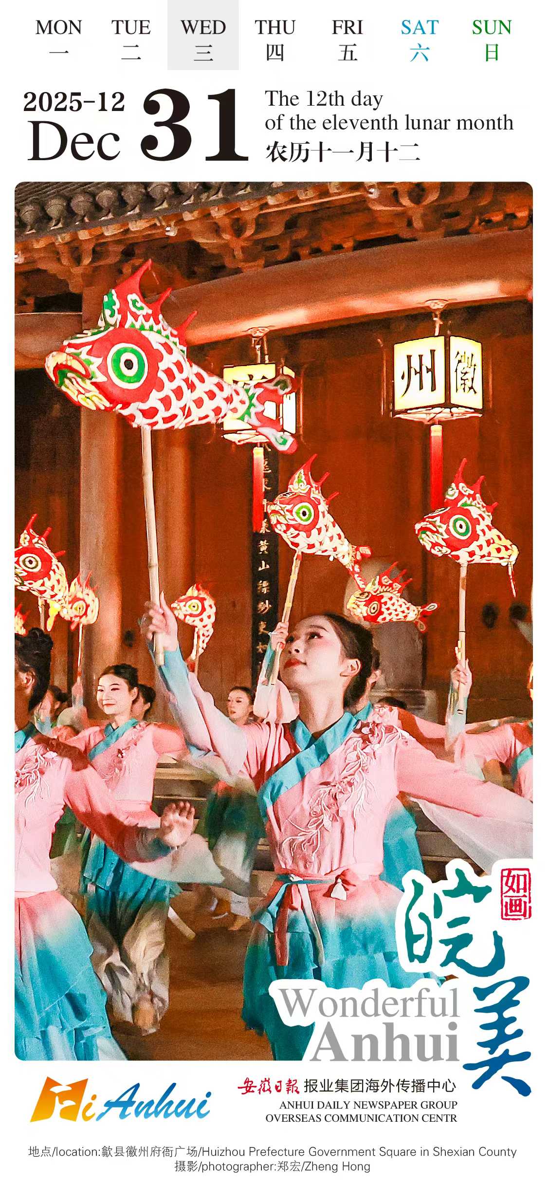 Follow the "Wonderful Anhui" English calendar on a virtual tour of Huizhou Prefecture Government Square to appreciate the iconic Hui-style folk custom of fish lantern performances in Shexian County, Huangshan City, Anhui.