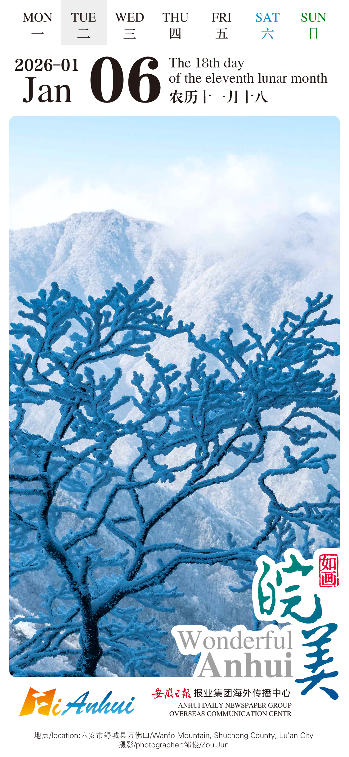Follow the "Wonderful Anhui" English calendar and feast your eyes on the breathtaking snow-covered scenery of Wanfo Mountain in Shucheng County, Lu’an City, Anhui