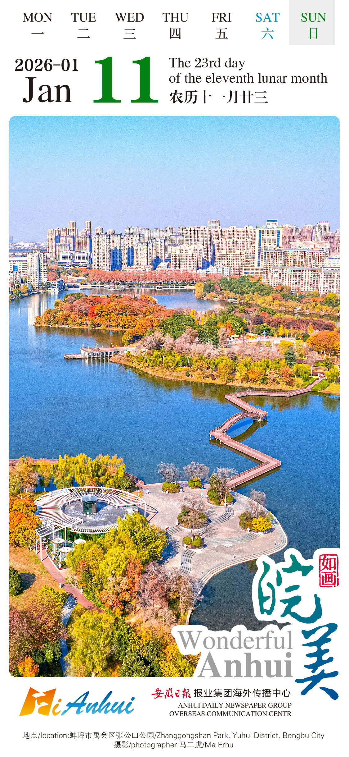 Follow today’s "Wonderful Anhui" English calendar on a virtual tour to Zhanggongshan Park where the forests with vibrant colors, the rippling lake, and modern buildings set off each other in Yuhui District, Bengbu City, Anhui.