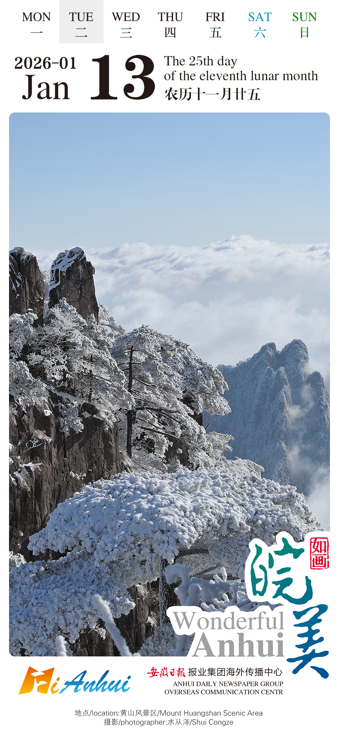 Join today’s "Wonderful Anhui" English calendar on a virtual tour of the fabulous Huangshan Mountain in Anhui where the snow blankets the peaks and turns the scenic area into a breathtaking wonderland.