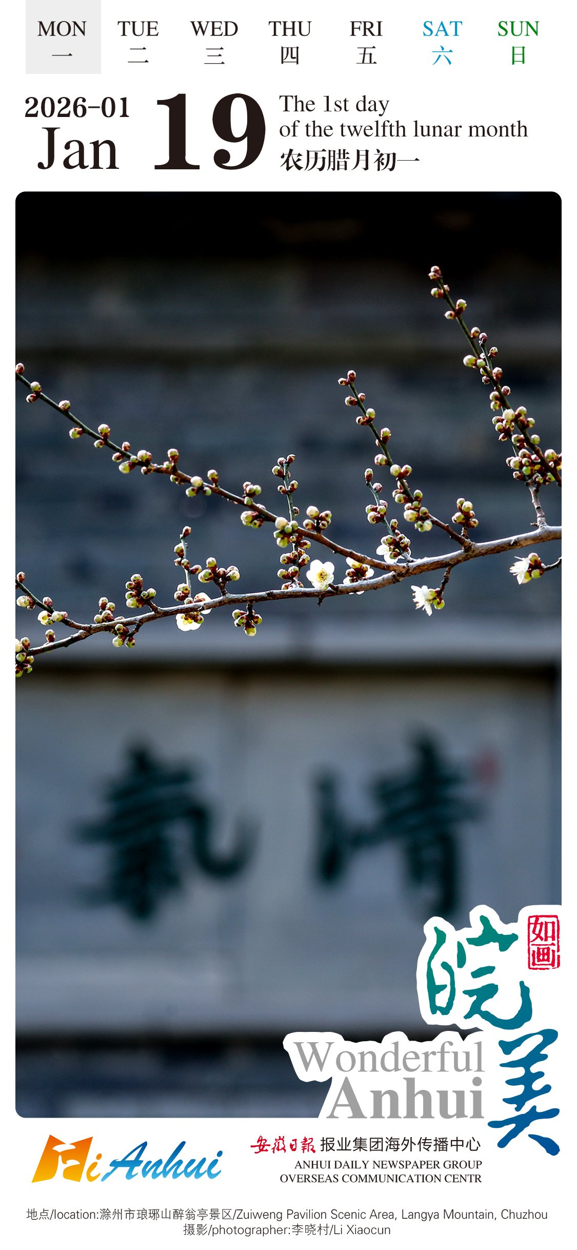 Join the "Wonderful Anhui" English calendar to appreciate the natural beauty of Zuiweng Pavilion in Langya Mountain where the plum blossoms have burst into bloom with its fragrance wafting through the air in Chuzhou City, Anhui.