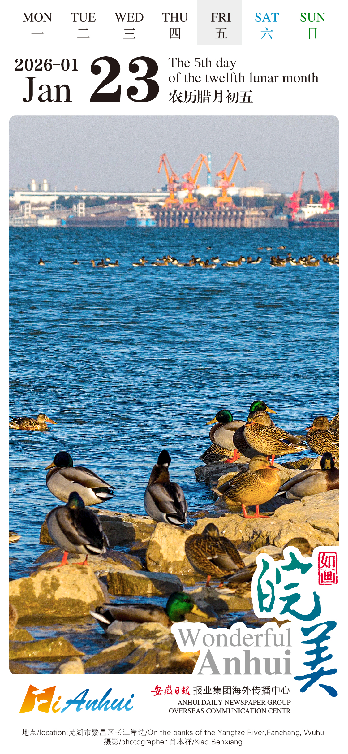Follow the "Wonderful Anhui" English calendar to dive into the enchanting ecological landscape on the banks of the Yangtze River where numerous migratory birds perch on the rocks over the river in Fanchang District, Wuhu City, Anhui.