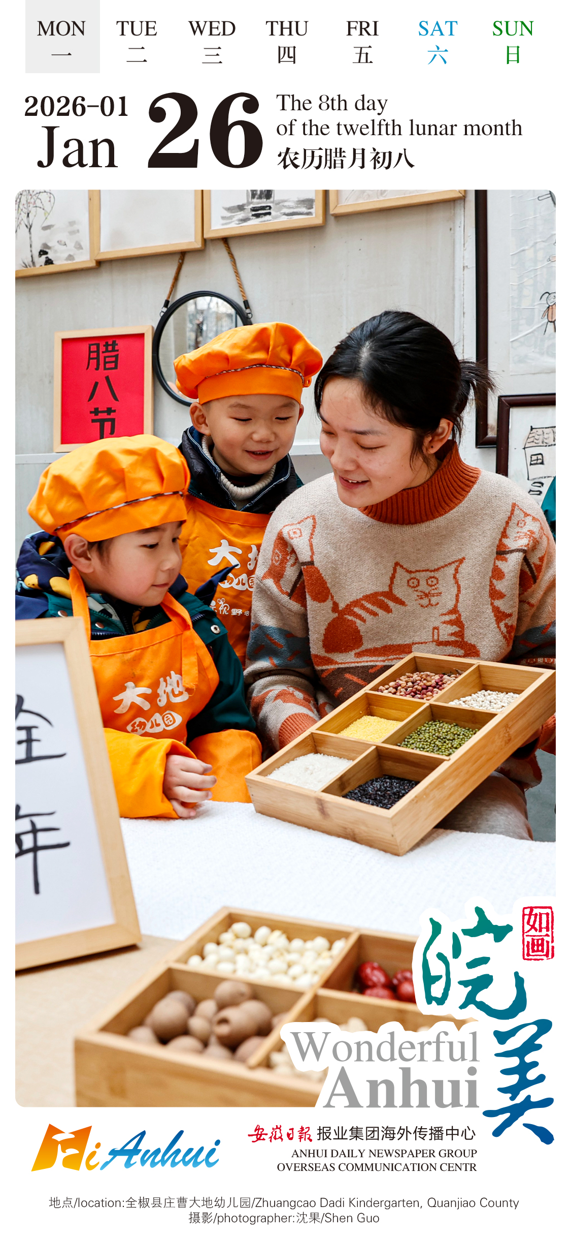 Today is the Laba Festival, which falls on the eighth day of the twelfth lunar month, marking the countdown to the Spring Festival. Follow the "Wonderful Anhui" English calendar, savor the warmth of Laba porridge, and see the vibrant festive atmosphere of Zhuangcao Dadi Kindergarten in Quanjiao County, Anhui.