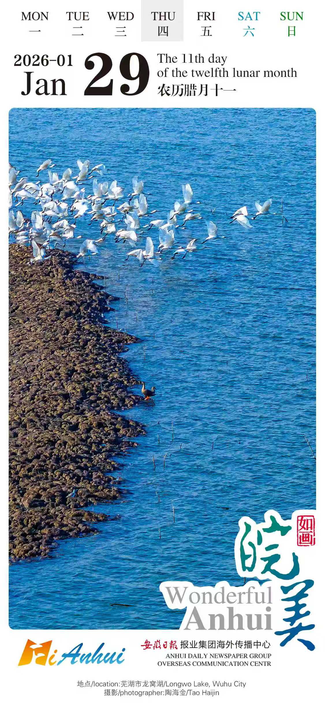 Embark on a virtual tour of Longwo Lake in Wuhu, Anhui with the "Wonderful Anhui" English calendar. Flocks of egrets fly across the shimmering and rippling blue waters, and some water birds perch on the banks, creating an enchanting natural landscape.