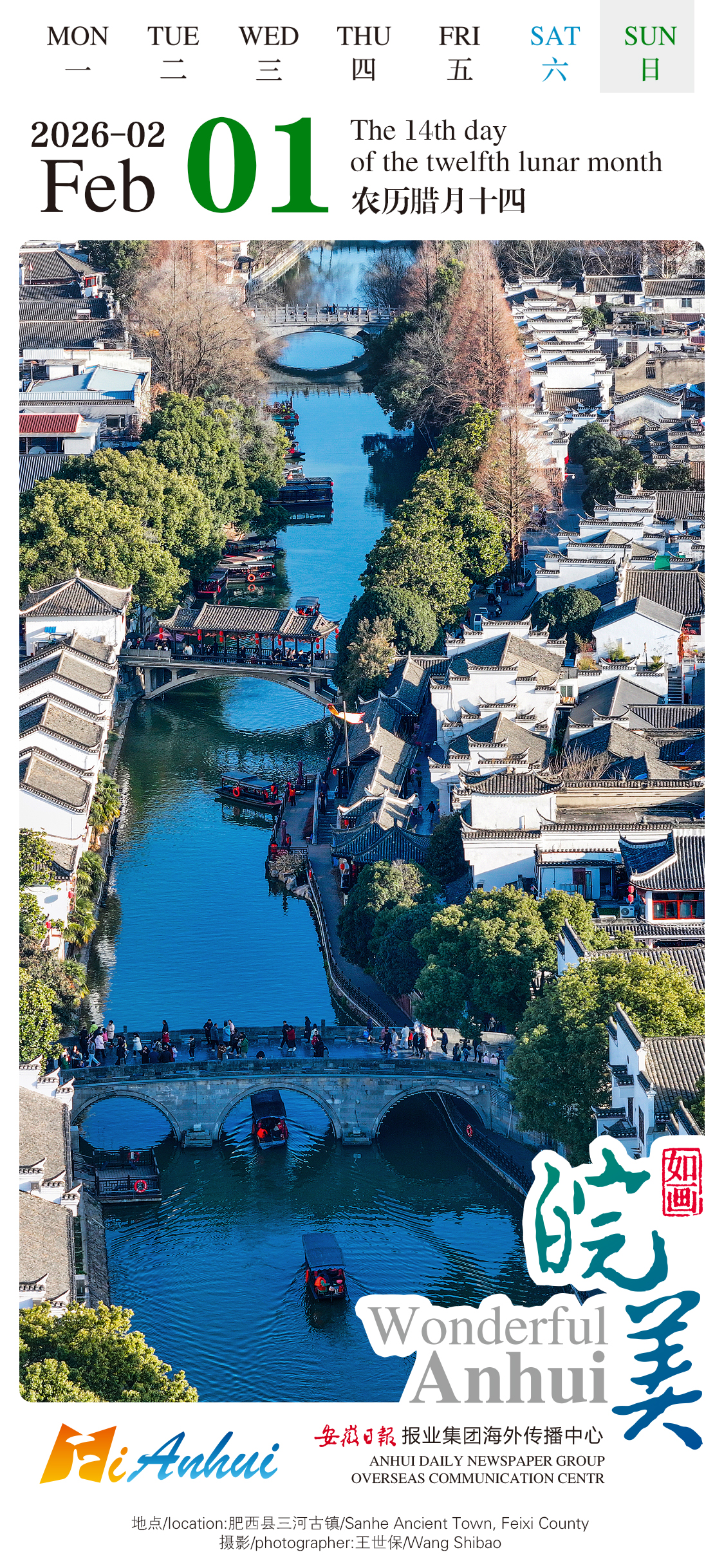 Follow the "Wonderful Anhui" English calendar and appreciate the delightful landscape of Sanhe Ancient Town in Hefei, Anhui, where you can take a boat ride and enjoy the charm of the traditional water town here.
