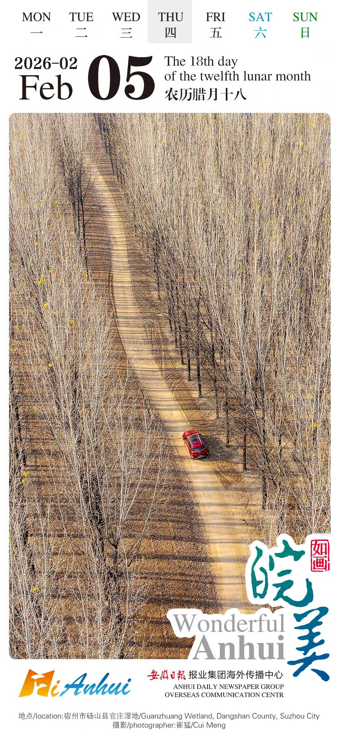Follow the "Wonderful Anhui" English calendar on a virtual tour to Guanzhuang Wetland, Dangshan County, Suzhou City, Anhui. Here, a vibrant red car glides along the winding road embraced by bare winter trees, adding a vivid color to the serene landscape.