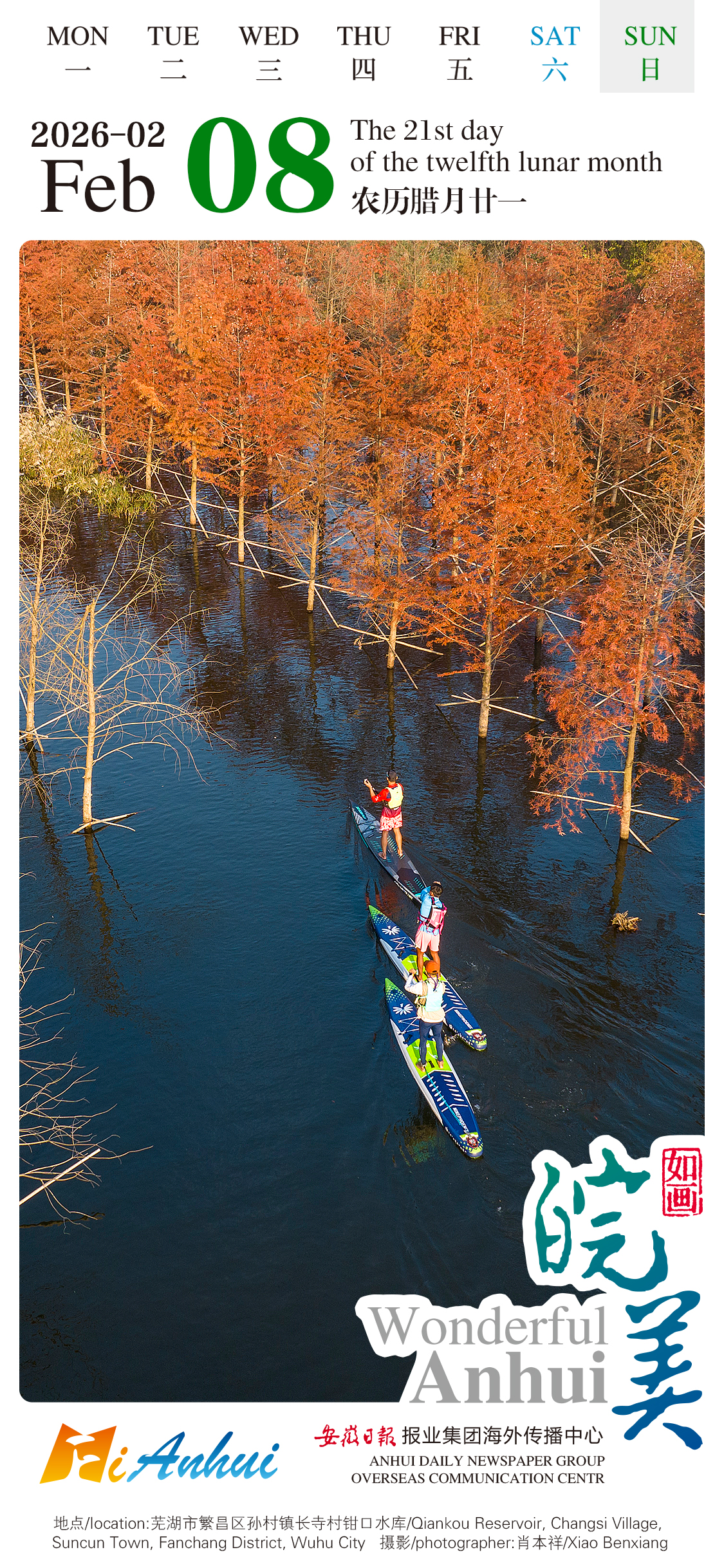 Join the "Wonderful Anhui" English calendar on a virtual tour of Qiankou Reservoir in Changsi Village, Suncun Town, Fanchang District, Wuhu City, Anhui. Take a boat ride over the rippling water, enjoy the vibrant-hued forests and lose yourself in the poetic scenery.