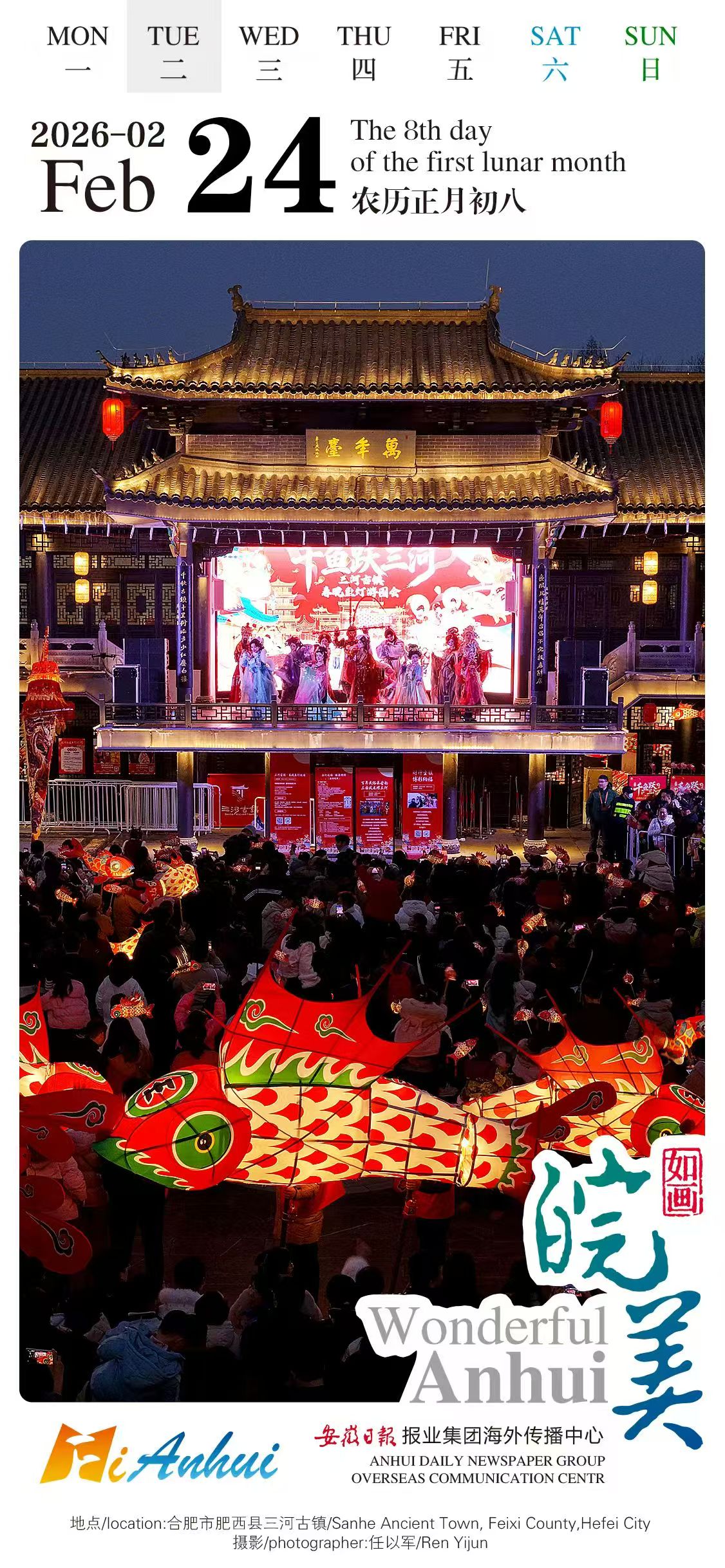 Join the "Wonderful Anhui" English calendar and embark on a journey to embrace festive vibes in Sanhe Ancient Town, Feixi County, Hefei City. Enjoy unique fish lanterns on ancient streets, appreciate spectacular performances on the stage, and feel the vibrant festive atmosphere here.
