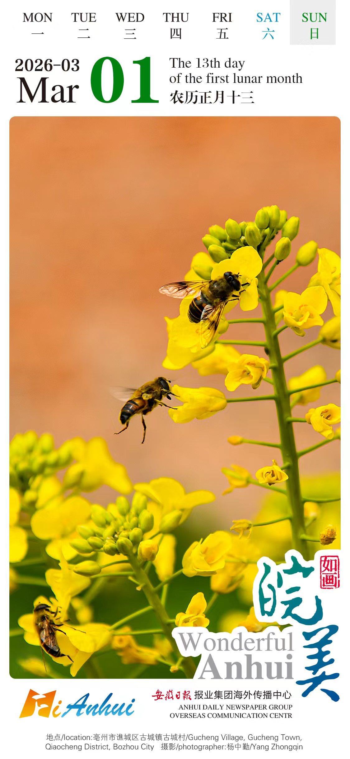 Start a tour to embrace vibrant spring scenery in Gucheng Village, Gucheng Town, Qiaocheng District, Bozhou City with today’s "Wonderful Anhui" calendar. Rapeseed flowers here have bloomed with their sweet fragrance drawing bees, painting a vivid portrait of early spring.